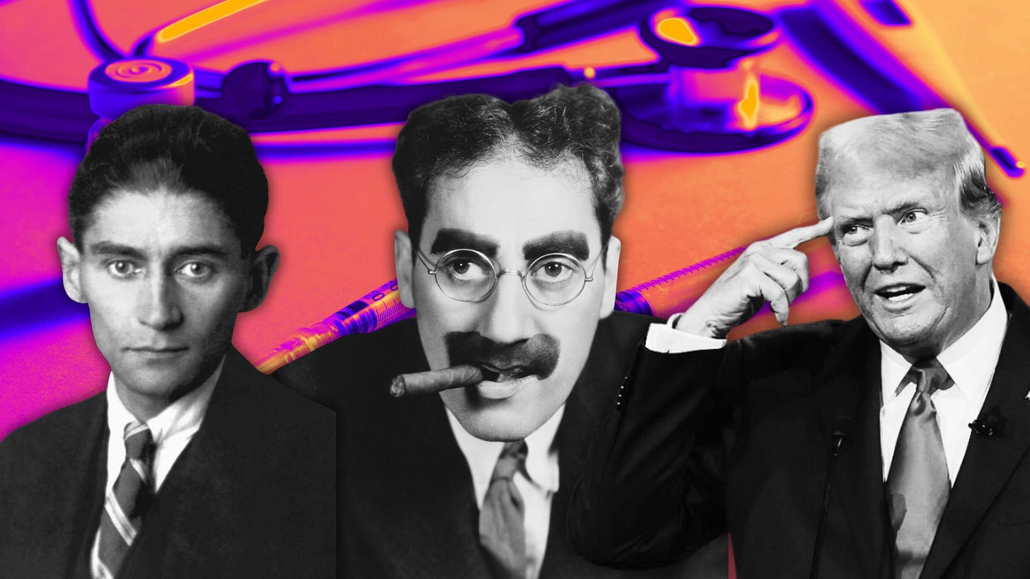 I mean America’s corporatized, bureaucratic, profiteering medical system. It’s as though the Marx Brothers and Franz Kafka conspired to create it.