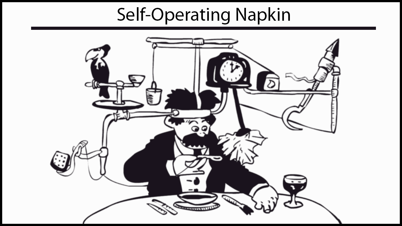 Goldberg was a master of satirical cartoons, drawing hilarious schematics of convoluted contraptions to do silly tasks. His “Self-Operating Napkin,” for example, involved a spoon, cracker, toucan, skyrocket, sickle, and a pendulum attached to a napkin – all operating sequentially to automatically wipe the chin of a soup eater.